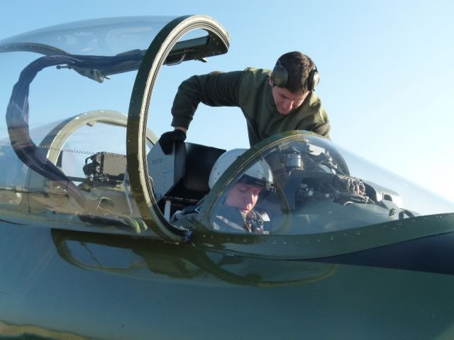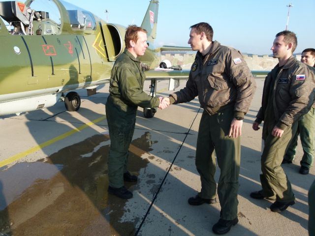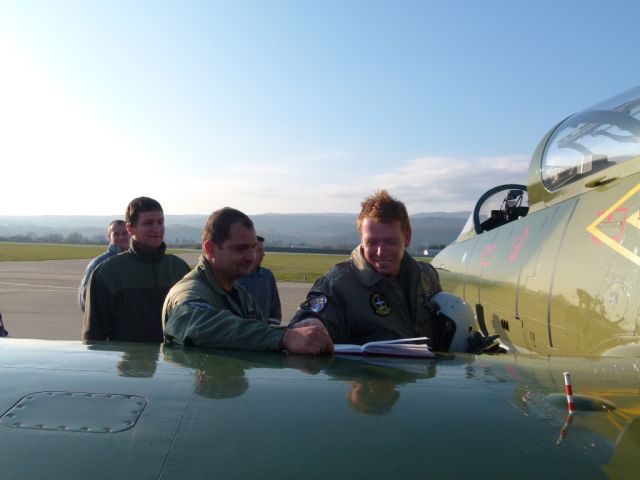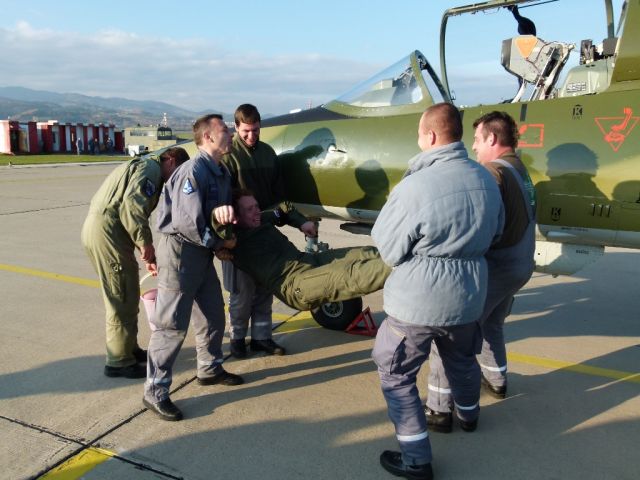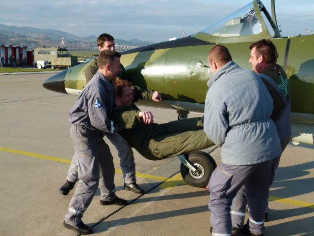 Po troch okruhoch a úspešnom pristáti Martin prijal gratulácie od veliteľa výcvikovej letky a od najbližších kolegov. Neminul ho ani tradičný ceremoniál v podobe kúpeľa a hobľa o trup lietadla.