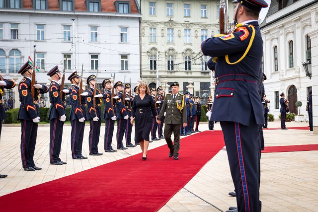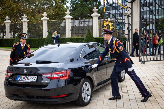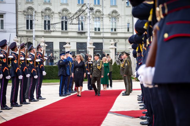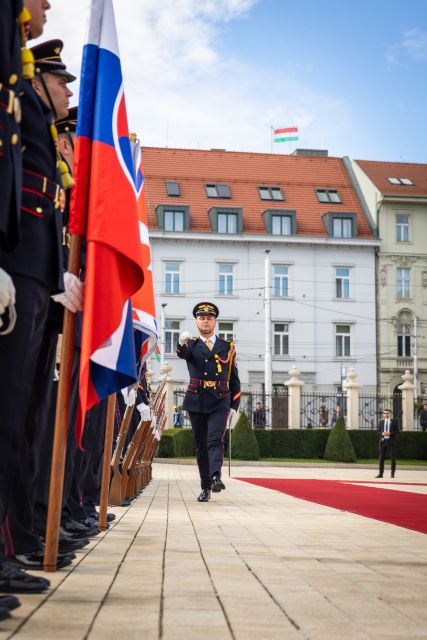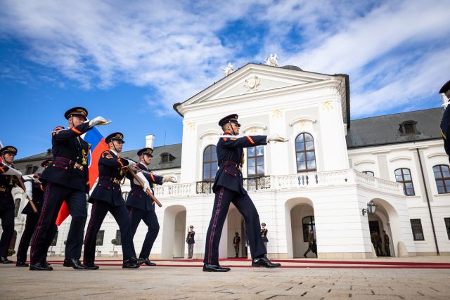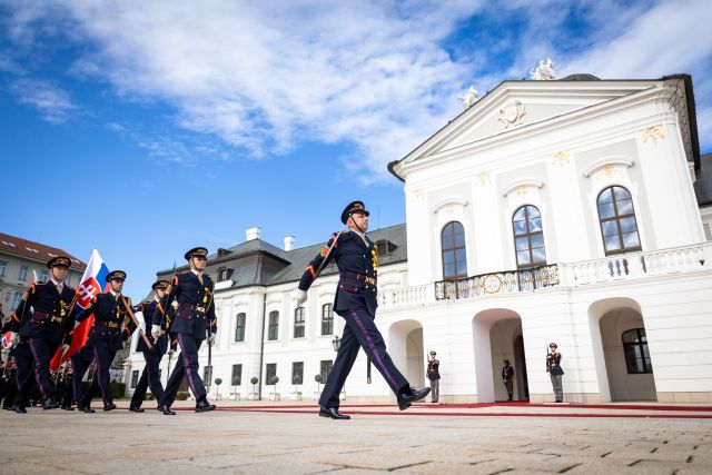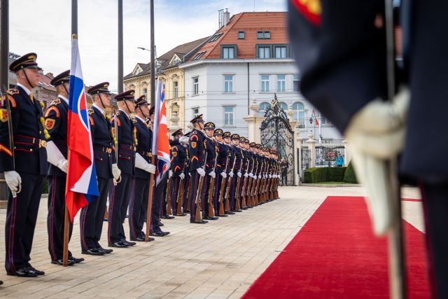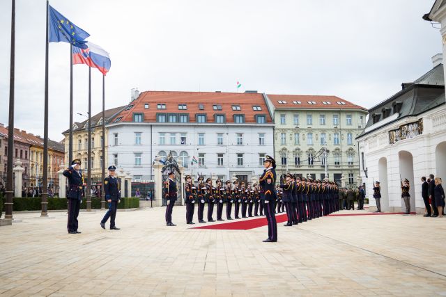 Plné pocty na prednom nádvorí Grasalkovičovho paláca zabezpečili príslušníci Čestnej stráže prezidenta SR pod velením majora Vladimíra RAKOVIČA.
