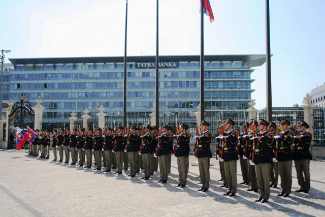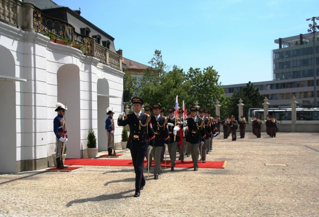 Privítací ceremoniál na nádvorí Prezidentského paláca zabezpečili príslušníci Čestnej stráže prezidenta Slovenskej republiky pod vedením veliteľa útvaru plukovníka Miroslava Ištvána.
