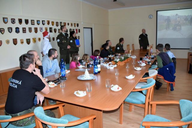 Nechýbalo malé pohostenie, ktoré deťom pripravili príslušníci Odboru podpory policajného výkonu Trenčín. Deťom čas spríjemnila prezentácia fotiek zo spoločných akcií a krátky film o činnosti Vojenskej polície. Na záver stretnutia sa deti osmelili, ich detské srdiečka pookriali a zaspievali príslušníkom Vojenskej polície pekné piesne.