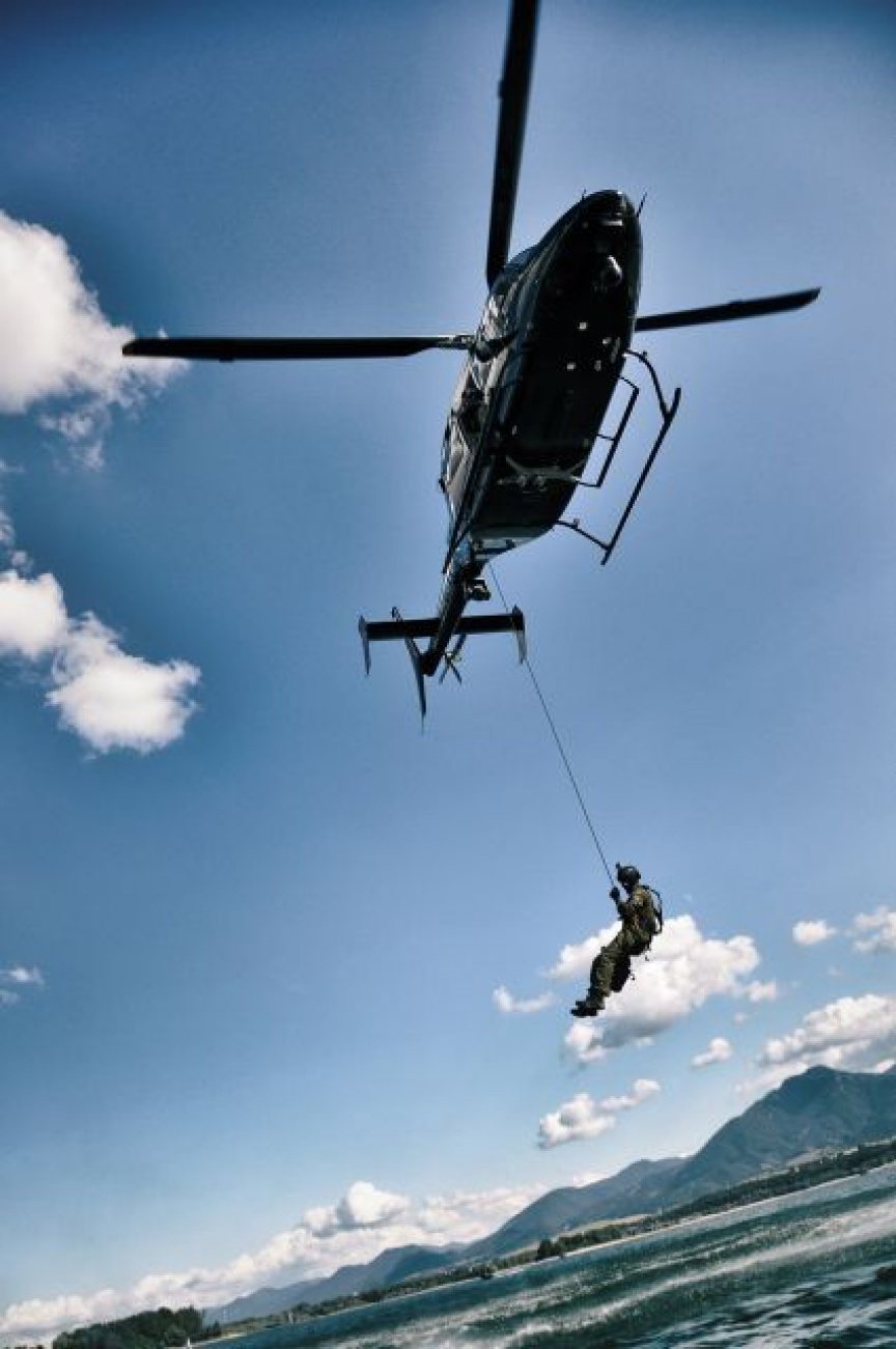 Poslednou z aktivít bolo rezanie lana pri zlaňovaní z vrtuľníka Mi-171 na vodnú hladinu, pričom pri každom „vysadení“ do vody si ostatní členovia na člnoch precvičovali rýchle manévrovanie a presnú jazdu k svojim kolegom vo vode. Počas čakania na vrtuľník s extrakčným lanom si členovia „obojživelnej skupiny“ precvičili aj taktický výsadok z idúceho člna.