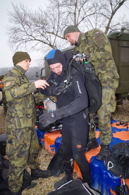 Pri svojej práci musia eliminovať najväčšie riziká pod vodnou hladinou. Zvládnuť prácu s navijakom. Lebo lano dokáže byť veľmi nebezpečné. Môžu sa do neho zamotať. Poručík Jakub Hynek, veliteľ ženijnej čaty ženijného práporu Běchyne si spoločný výcvik pochvaľuje. Z českej strany sa ho zúčastňujú takmer dve desiatky potápačov zo ženijných práporov Běchyne a Olomouc, zo slovenskej potápači seredského ženijného práporu zo Serede a Michaloviec. Práporčík Michal Strejc, je skúšobný komisár Armády ČR pre potápanie, hlavný odborník v AČR pre túto oblasť: „ Pre našich potápačov je spoločný výcvik so slovenskými kolegami vítanou príležitosťou na získanie nových skúseností. Hlavne z práce s navijakom pod vodnou hladinou. Z hľadiska bezpečnosti je potrebné, aby potápač pod vodu nenosil žiadne zbytočné veci. Mohli by zapríčiniť nehodu, mimoriadnu udalosť a ohroziť bezpečnosť, ale aj život potápača. Napríklad hadica navyše sa môže zapliesť do nejakého koreňa. Cvičíme úlohy zimného potápania, bez ohľadu na to, či je nad nami ľad. Používame tie isté postupy. Budem radi, keď naši slovenskí kolegovia zavítajú cvičiť aj do našich lokalít, najmä na severnej Morave.“