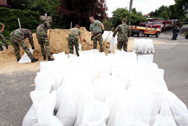 Dvadsať jeden vojakov práporu Radiačnej, chemickej a biologickej ochrany v Rožňave od rána pomáha obyvateľom obce Čučma pri ukladaní vriec s pieskom proti povodni, ktorá hrozí z miestnym potokov. K dispozícii majú aj vozidlo Tatra 815.