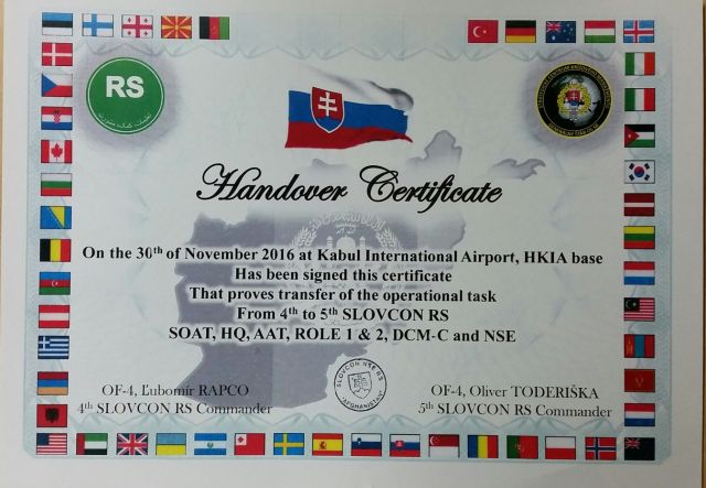 Slávnostné odovzdanie a prevzatie operačnej úlohy medzi veliteľom 4. a 5. SLOVCONU sa uskutočnilo dňa 30. novembra. Zástupca veliteľa strategického centra krízového manažmentu GŠ OS SR plukovník Marek tu vyhodnotil činnosť dosiaľ plnených operačných úloh, poďakoval za výbornú prácu príslušníkom 4.SLOVCON RS Afganistan pod velením podplukovníka Rapca a veliteľovi 5. SLOVCONU podplukovníkovi Toderiškovi a jeho príslušníkom zaprial veľa správnych rozhodnutí pri plnení úloh v operácii Resolute Support v Afganistane.